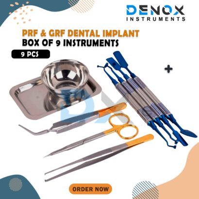 PRF GRF Dental Implant Box 9 Pcs Set Instruments Surgical Surgery Tools Kit CE Description: Autoclavable Passivated Ultrasonic Cleaned Rust Free Premium OR Grade Quality Stainless Steel Manufactured from AISI 420 Stainless Steel. Product Conforms to ISO 9001, CE-Quality Mark, ISO 13485, FDA and other Quality Standards High Grade finish